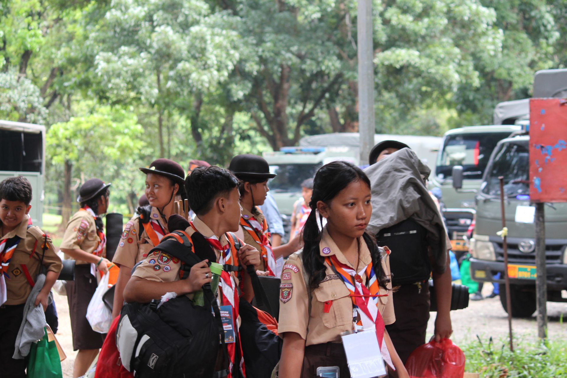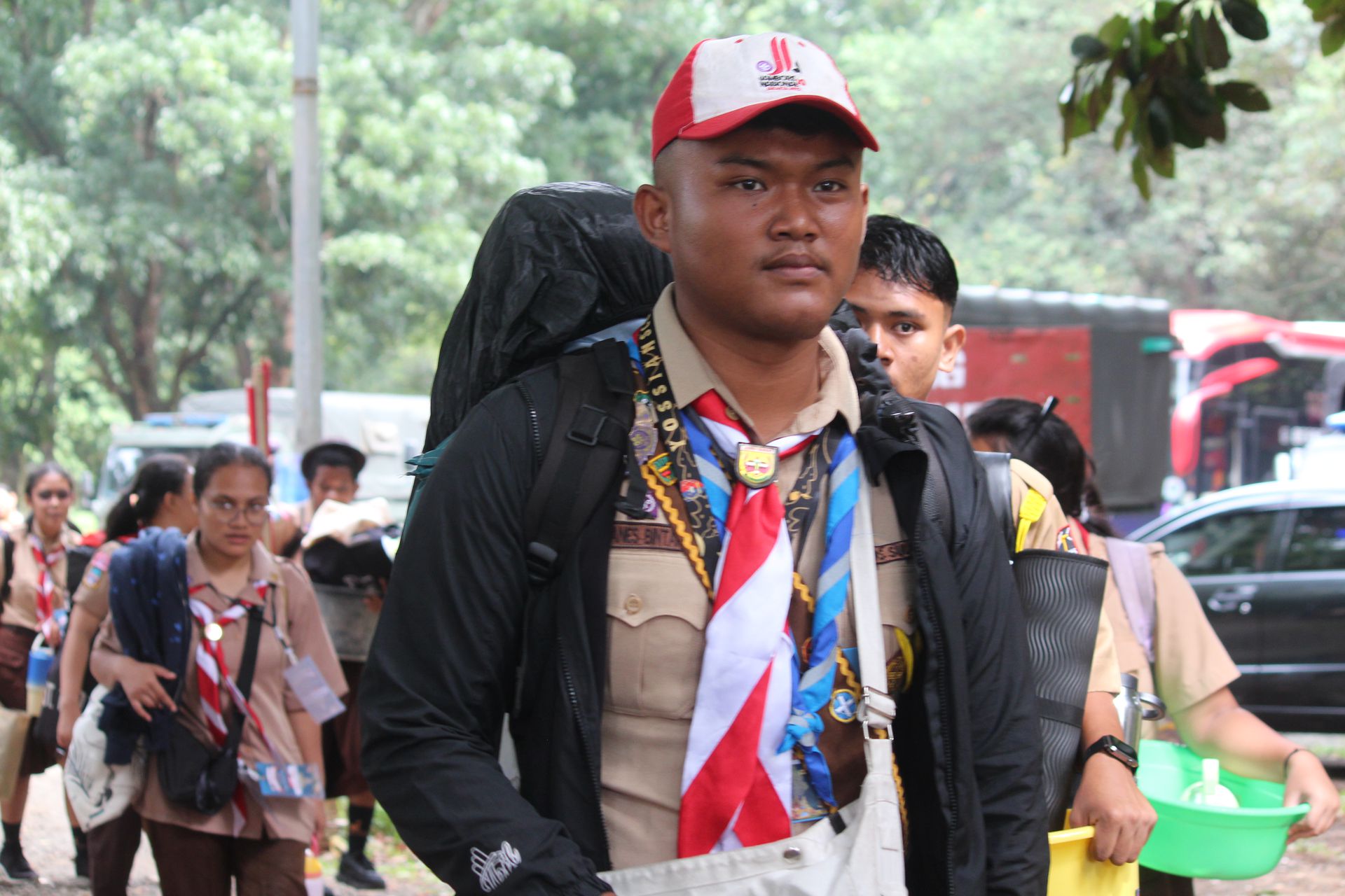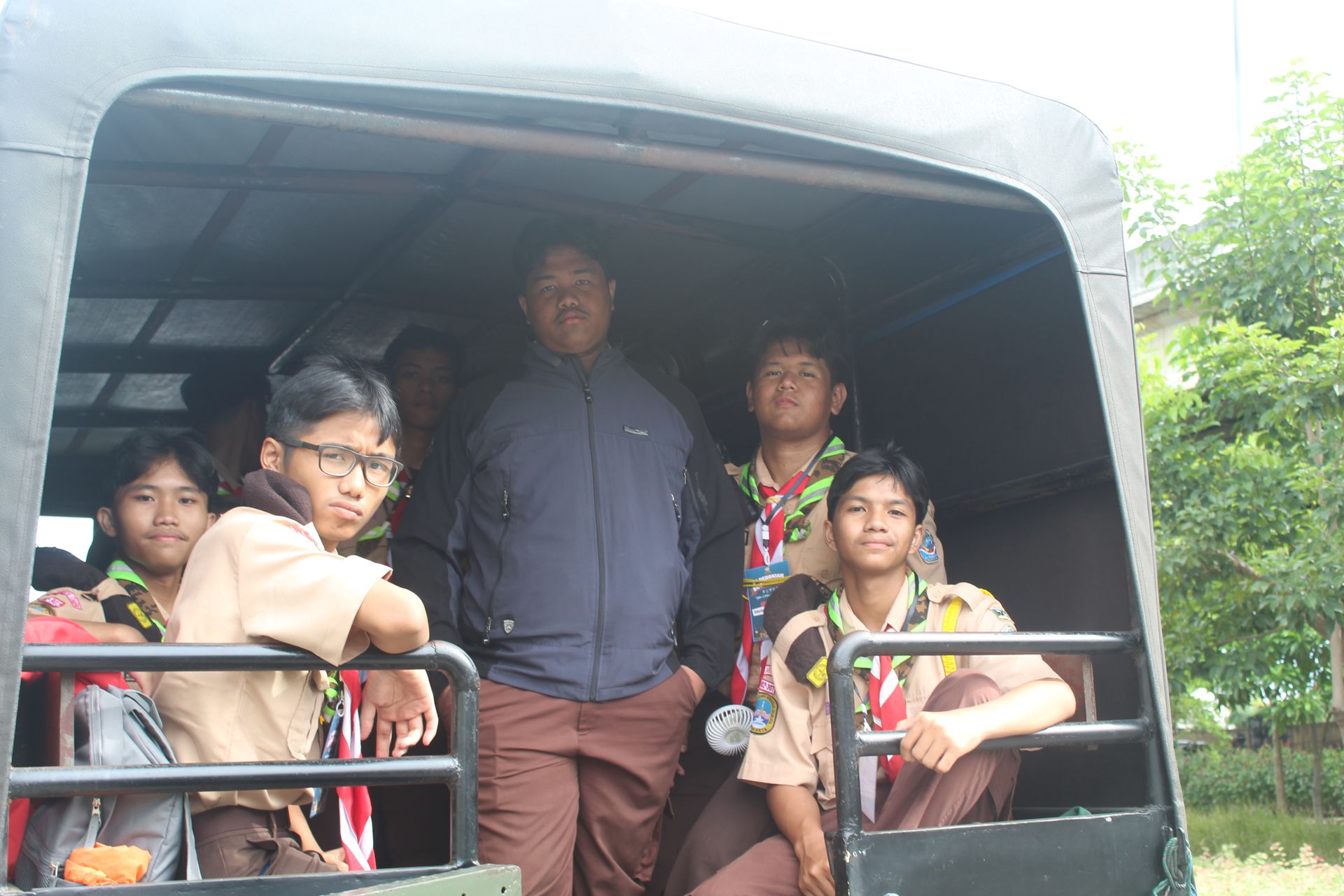 Setelah upacara selesai, para peserta kembali ke area masing-masing untuk mengambil barang. Mereka kemudian memasukkan perlengkapan ke dalam tronton sesuai arahan panitia. Proses keberangkatan diatur berdasarkan pembagian kendaraan sehingga seluruh peserta dapat berangkat dengan tertib menuju Buperta.