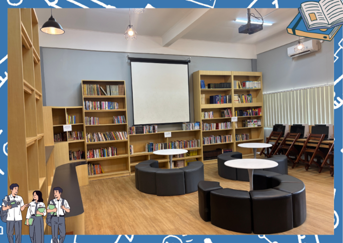 Suasana di ruang perpustakaan biasanya sangat tenang dan kondusif untuk belajar atau membaca. Penerangan lembut dengan lampu yang terfokus pada meja-meja bacaan menciptakan suasana yang nyaman. Rak-rak penuh buku tersusun rapi, dengan berbagai jenis buku mulai dari fiksi, non-fiksi, hingga referensi akademis.