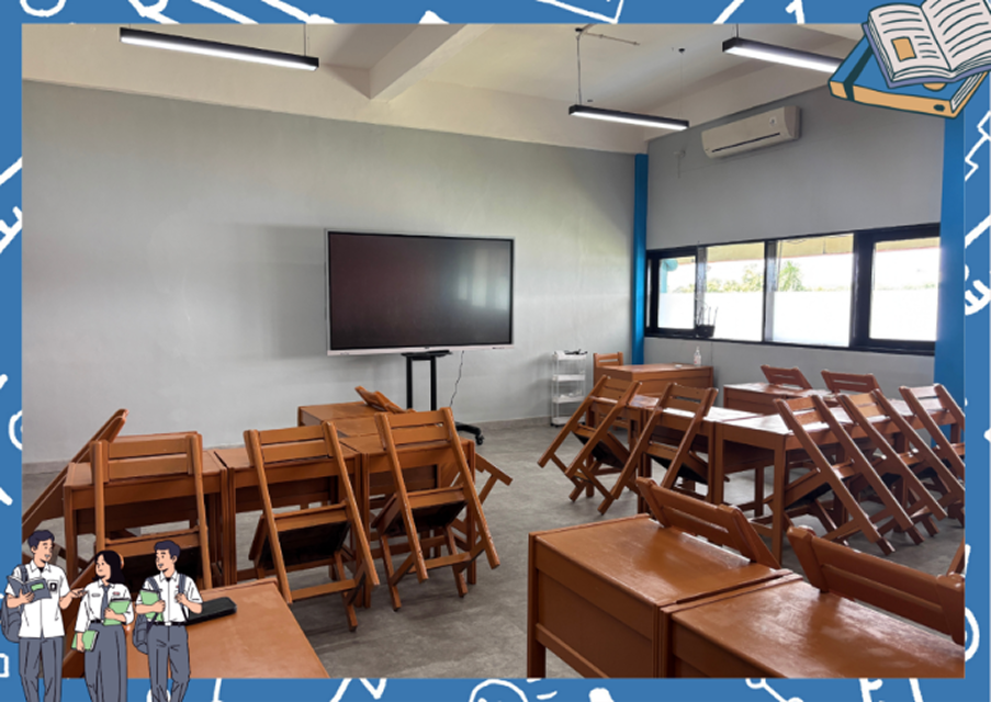 Ruang interaktif ini dirancang untuk mendukung pembelajaran, presentasi, dan kolaborasi kreatif dengan menggunakan layar besar sebagai pusatnya. Ruang ini dilengkapi dengan layar sentuh berukuran besar yang berfungsi untuk menampilkan materi pembelajaran, presentasi visual, dan video. Layar ini dapat diakses secara interaktif, memungkinkan pengguna untuk menggambar, menulis, dan menggeser konten hanya dengan sentuhan.